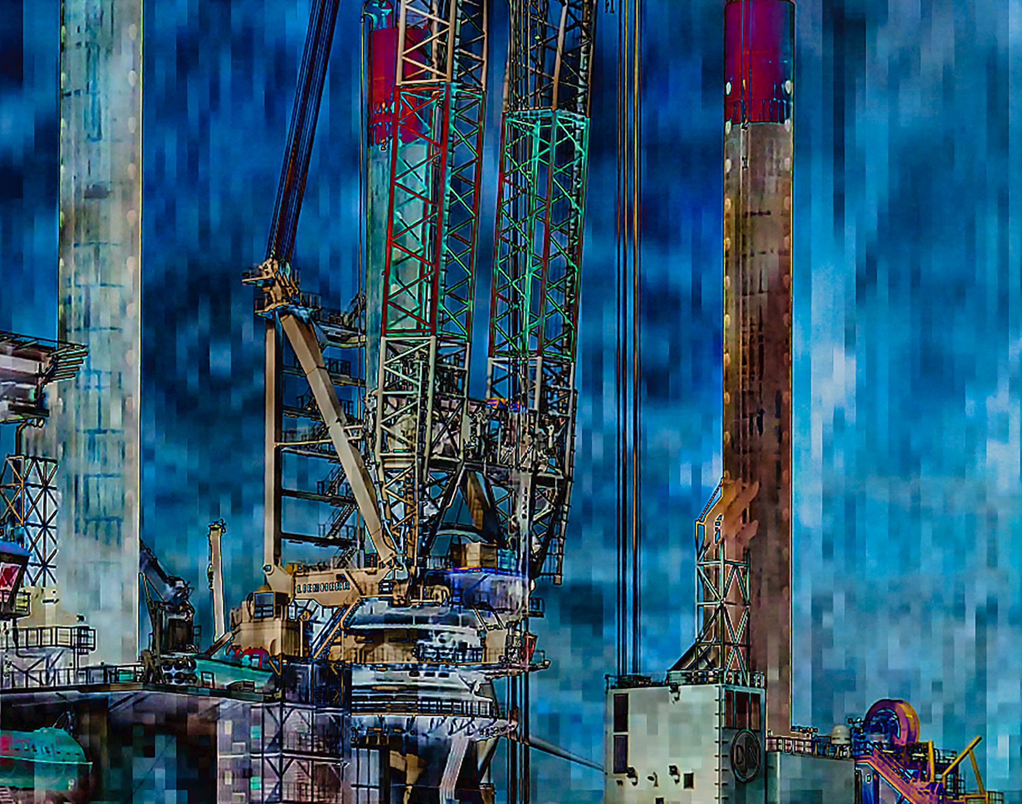 In this work, the rigid geometry of industry dissolves into fields of colour, light and fragmented texture. The result is a composition that feels both mechanical and organic, structured yet volatile. Hannon’s approach reflects his broader practice of renewal and reuse, where forms are reborn through digital abstraction.